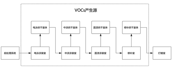 根据涂装生产工艺,涂装废气主要来自于前处理、喷涂、烘干过程,所排放的污染物主要为:前处理过程中产生的粉尘或酸雾,喷漆时产生的漆雾和有机溶剂,烘干挥发时产生的有机溶剂。漆雾主要来自于空气喷涂作业中溶剂型涂料飞散的部分,其成分与所使用的涂料一致。有机溶剂主要来自于涂料使用过程中的溶剂、稀释剂,绝大部分属挥发性排放,其主要的污染物为甲苯、二甲苯等。涂装中排放的有害废气主要集中在喷漆生产线上,其中喷漆室、流平室、烘干室是废气的主要发生源。